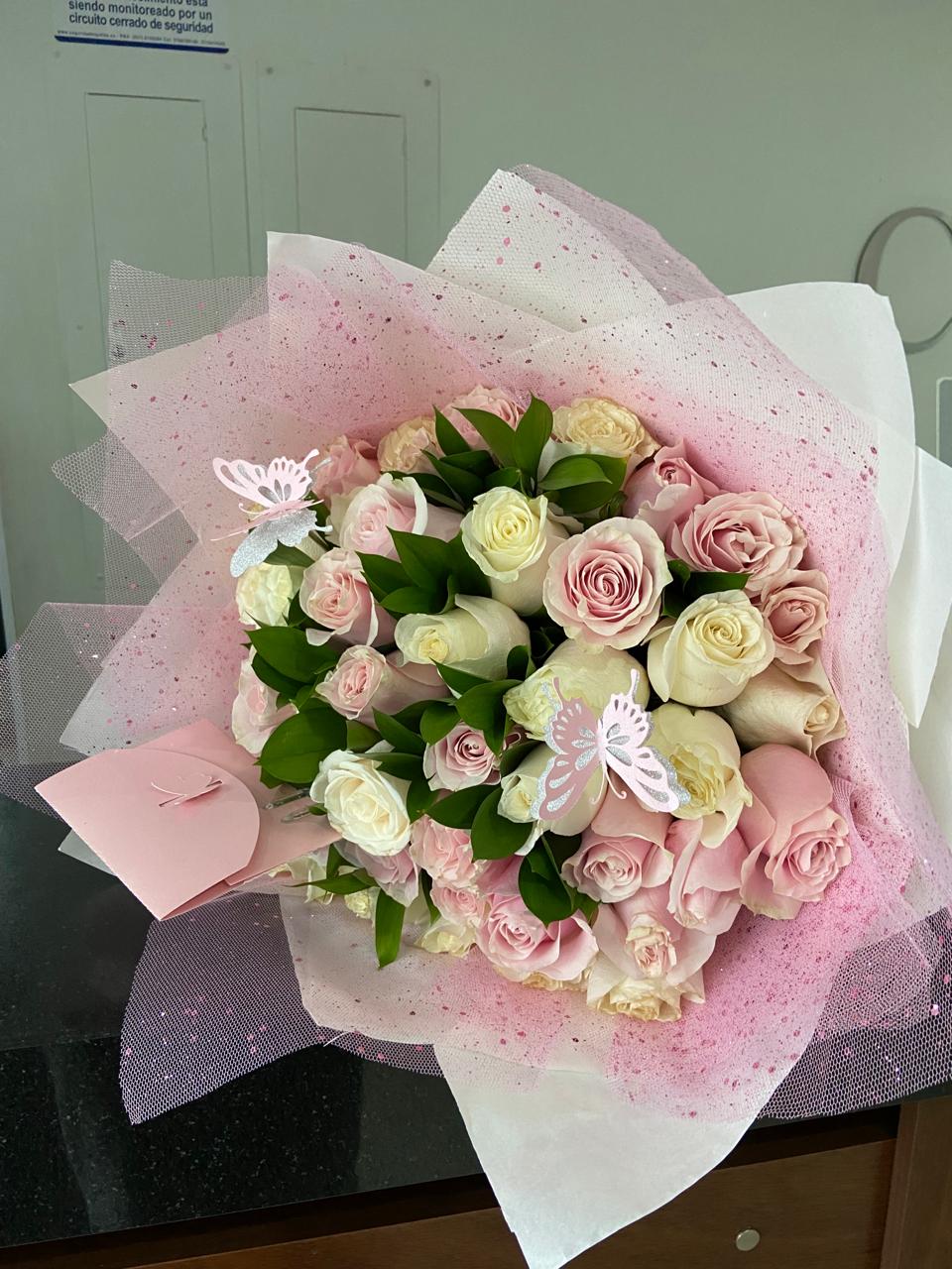 Bouquet de 50 rosas tipo exportación, decorado con papelería coreana y tarjeta impresa.